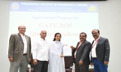 నమిత న్యూస్ - Andhra Pradesh / Annamayya : మదనపల్లె - మే20 : అంగళ్ళు సమీపం లో గల మదనపల్లె ఇన్స్టిట్యూట్ ఆఫ్ టెక్నాలజీ & సైన్స్ (మిట్స్) కళాశాల నందు జాతీయ స్థాయిలో నిర్వహించే గేట్ 2025 అర్హత సాధించిన విద్యార్థులను ప్రశంసా కార్యక్రమం ను నిర్వహించారు. ఈ కార్యక్రమం లో కళాశాల ప్రిన్సిపాల్ డాక్టర్ సి. యువరాజ్ మాట్లాడుతూ గ్రాడ్యుయేట్ ఆప్టిట్యూడ్ టెస్ట్ ఇన్ ఇంజనీరింగ్ పరీక్షలో విజయవంతంగా అర్హత సాధించిన విద్యార్థులను ప్రశంస కార్యక్రమాన్ని నిర్వహించామని ఆయన అన్నారు. మొత్తం 22 మంది విద్యార్థులు కళాశాల నందు గేట్ కు అర్హత అయ్యారని, అందులో సివిల్ ఇంజనీరింగ్ నుంచి 2, కంప్యూటర్ సైన్స్ అండ్ ఇంజనీరింగ్ విభాగము నుంచి 9, ఎలక్ట్రానిక్స్ అండ్ కమ్యూనికేషన్ ఇంజనీరింగ్ నుంచి 5, కంప్యూటర్ సైన్స్ అండ్ టెక్నాలజీ నుంచి 2, ఆర్టిఫిషల్ ఇంటెలిజెన్స్ 4, డేటా సైన్స్ ఒక్కరు అని ఆయన అన్నారు. ఆయన విద్యార్థుల కృషిని ప్రశంసించారు మరియు ఈ అద్భుతమైన మైలురాయి వైపు వారిని నడిపించడంలో అధ్యాపకుల నిరంతర మద్దతును ప్రశంసించారు. తన ప్రసంగంలో, గేట్ వంటి పోటీ పరీక్షల ప్రాముఖ్యతను ఆయన చెప్పారు, ఇది ప్రతిష్టాత్మకమైన ఉన్నత విద్య సంస్థలకు మరియు ప్రభుత్వ రంగ సంస్థలు మరియు పరిశోధనా సంస్థల్లో అవకాశాలకు నాంది అన్నారు. ఈ కార్యక్రమంలో వివిధ ఇంజనీరింగ్ విభాగాలకు చెందిన మొత్తం 22 మంది విద్యార్థులను వారి కృషి మరియు పట్టుదలకు గుర్తింపుగా ప్రశంసా పత్రాలు మరియు జ్ఞాపికలతో సత్కరించారు. విభాగాధిపతులు, అధ్యాపక సభ్యులు మరియు మార్గదర్శకులు కూడా విజేతలను అభినందించడంలో పాల్గొన్నారు మరియు జూనియర్లకు స్ఫూర్తినిచ్చే ప్రేరణాత్మక అంతర్దృష్టులను పంచుకున్నారు. గేట్ అర్హత సాధించిన వారు తమ తయారీ వ్యూహాలు మరియు అనుభవాలను పంచుకున్నారు. కార్యక్రమం లో వైస్ ప్రిన్సిపాల్ డాక్టర్ రామనాథన్, డీన్ శ్రీమంత బసు అధ్యాపకులు పాల్గొన్నారు. విద్యార్థులను కరెస్పాండంట్ డాక్టర్ యెన్. విజయ భాస్కర్ చౌదరి, ఎగ్జిక్యూటివ్ డైరెక్టర్ కీర్తి నాదెళ్ల తదితరులు అభినందనలు తెలియజేసారు.