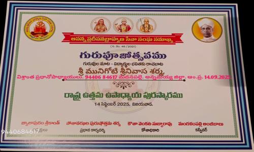 నమిత న్యూస్ - Andhra Pradesh / Annamayya : ఆంధ్ర ప్రదేశ్ రాష్ట్ర స్థాయి బ్రాహ్మణ ఉత్తమ ఉపాధ్యాయులకు పురస్కార ప్రధానోత్సవం - మదనపల్లి విశ్రాంత హెచ్ ఎం మునిగోటి శ్రీనివాస శర్మ కు ఘనంగా సన్మానం ఆపన్న ప్రదీపన బ్రాహ్మణ సేవా సంఘ సమాఖ్య ఆంధ్ర ప్రదేశ్ రాష్ట్ర శాఖ, విజయవాడ వారి ఆధ్వర్యంలో ఆంధ్ర ప్రదేశ్ రాష్ట్ర స్థాయి బ్రాహ్మణ ఉత్తమ ఉపాధ్యాయ పురస్కారాలు 2025 ప్రధానోత్సవ కార్యక్రమం నిర్వహించారు. ఆం.ప్ర దేవాదాయ ధర్మాదాయ శాఖ మాజీ ప్రభుత్వ సలహాదారు, రాష్ట్ర అధ్యక్షుడు జ్వాలాపురం శ్రీకాంత్ ఆధ్వర్యంలో గుంటూరు బ్రాడీ పేట లోని బ్రాహ్మణ సేవా సమితి భవనము నందు ఘనంగా జరిగింది. బ్రాహ్మణ ఉపాధ్యాయు లందరినీ ఒక వేదికపైకి చేర్చి, వారిని సత్కరించ డానికి ఈ కార్యక్రమాన్ని ఏర్పాటు చేశారు. తొలి ప్రయత్నంగా ఆంధ్ర ప్రదేశ్ నుండి రాష్ట్ర బ్రాహ్మణ ఉత్తమ ఉపాధ్యాయ అవార్డులను అంద చేయాలనే సంకల్పంతో ఈ ఏడాది సత్కరించడం జరిగిందని జ్వాలాపురం శ్రీకాంత్ తెలిపారు. ఈ పురస్కారోత్సవ కార్యక్రమం పోతావఝుల పురుషోత్తమ శర్మ , ప్రధాన కార్యదర్శి నేతృత్వంలో జరగ్గా, ఆచార్య నాగార్జున విశ్వ విద్యాలయం సంగీత విభాగం అధ్యాపకు రాలు డాక్టర్ మంజుల చింతల పాటి, ముఖ్య అథితులు గా ఆచార్య జీ.ఎస్.ఆర్. కృష్ణమూర్తి, ఉప కులపతి, అధ్యాపకులు డాక్టర్ ఎస్.టీ.విష్ణువర్ధన్, జాతీయ సంస్కృత విశ్వవిద్యాలయము, తిరుపతి, ఓరుగంటి నవీన్, ఈచంపాటి కృష్ణమాచారి, ఇక్కుర్తి వెంకట్ లు, ఆత్మీయ అథితులుగా కౌతా సుబ్బారావు, బందా రవి, నందిరాజు పాండురంగా రావు, తుళ్ళూరు ప్రకాష్ లు, గౌరవ అథితులుగా మంగళంపల్లి అంజిబాబు, కలిసపాటి లక్ష్మీ నారా యణ, మామిళ్ళపల్లి అయ్యప్ప లు పాల్గొని సన్మాన గ్రహీతలకు ఉత్తమ ఉపాధ్యాయ పురస్కారాలను బహూకరించారు. ఈ కార్యక్రమంలో మదనపల్లె విశ్రాంత ప్రధానోపా ధ్యాయులు మునిగోటి శ్రీనివాస శర్మ కు ఉత్తమ ఉపాధ్యాయ పురస్కారాన్ని అన్నమయ్య జిల్లా నుండి ఏకైక వ్యక్తిగా అందు కున్నారు. ఈ సంధర్భంగా మాట్లాడుతూ గురువు విలువను తెలియచేస్తు అజ్ఞానాంధ కారాన్ని పారద్రోలి విజ్ఞాన జ్యోతిని వెలిగించి సన్మార్గాన్ని చూపిన గురువులు మహోన్నతు లని, అటువంటి గురువులను స్మరించుకొని, పూజించు కోవడమే గురుశిష్య సంబందానికి ప్రతీకని మునిగోటి శ్రీనివాస శర్మ పేర్కొన్నారు.