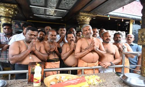నమిత న్యూస్ - Andhra Pradesh / చిత్తూరు : సదుం - డిసెంబర్ 04 : మాజీ మంత్రి పెద్దిరెడ్డి రామచంద్రా రెడ్డి గురువారం వేకువజామున తిరుపతి కపిలతీర్థం లో అయ్యప్ప స్వామి మాల ధారణ చేసి , స్వగ్రామం లో వెలసియున్న కోటమలై అయ్యప్ప స్వామి ని దర్శించుకున్నారు . గత కొన్ని సంవత్సరాలుగా సంవత్సరం లో రెండు పర్యాయాలు అయ్యప్పస్వామి మాల ధారణ చేసే కోవ లోనే నేడు అయ్యప్ప మాల ధారణ చేశారు. కోటమలై అయ్యప్ప స్వామి గుడి లో ఎమ్మెల్యే ద్వారక నాథ్ రెడ్డి కూడా అయ్యప్ప స్వామి మాల ధారణ చేశారు